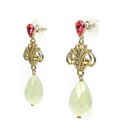 耳針為三爪鑲水滴形水晶;耳針與墜飾皆為純銀鍍18K金材質;水晶部分採用Crystallized-施華洛世奇元素;耳環總長為1 1/2英吋;圖騰墜飾尺寸大小為18mm × 16mm;水滴形玉石尺寸大小為20mm × 12mm