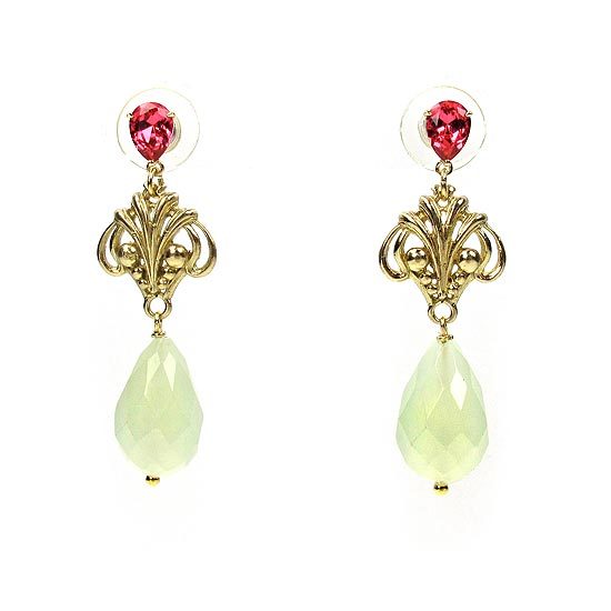 耳環以具新藝術風格的典雅圖騰墜飾搭配柚色水滴玉石,隨著姿態擺晃風采迷人,十足女人味,為一款搶眼好搭的夢幻逸品!
