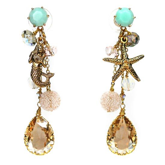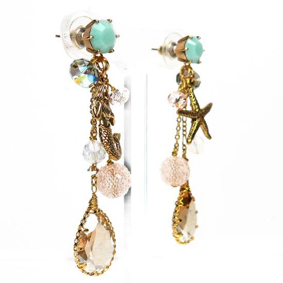 耳環兩邊採不對襯設計,一邊為美人魚墜飾,另一邊則為海星墜飾,搭配多色SWAROVSKI水晶球及樹脂球點綴,下方的水滴形狀SWAROVSKI水晶,以精緻的純銀鍍18K金色花邊包編而成,會隨著身體擺動,閃耀迷人。