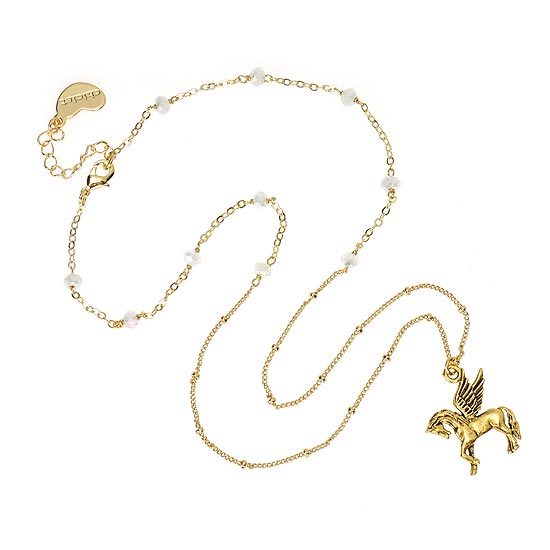 鍊身為合金鍍18K金材質;鍊子總長為17½英吋;延長鍊1½英吋;飛馬墜飾尺寸為18mm ×20mm;琉璃珠直徑為3mm×4mm