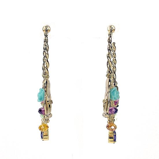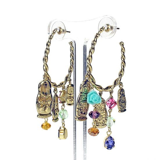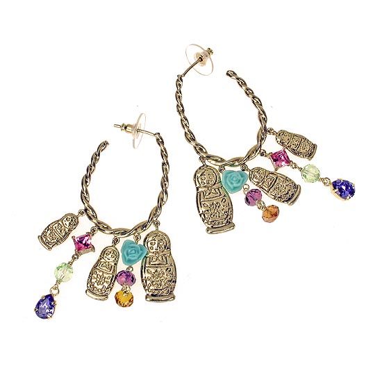 以不同大小的俄羅斯娃娃墜飾,搭配各式水晶及立體玫瑰浮雕耳環,充滿俄羅斯風情的設計配戴起來繽紛活潑!耳針為純銀鍍金,墜飾座臺為合金材質。