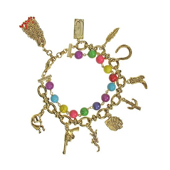 彩色松石與仿古金色手工鍊身組成的雙層流蘇手鍊,並垂墜多樣的印地安幸運墜飾,率性、繽紛的讓人目不轉睛,不論單獨配戴或是搭配其他手鍊營造多層次,皆活潑、亮眼!
