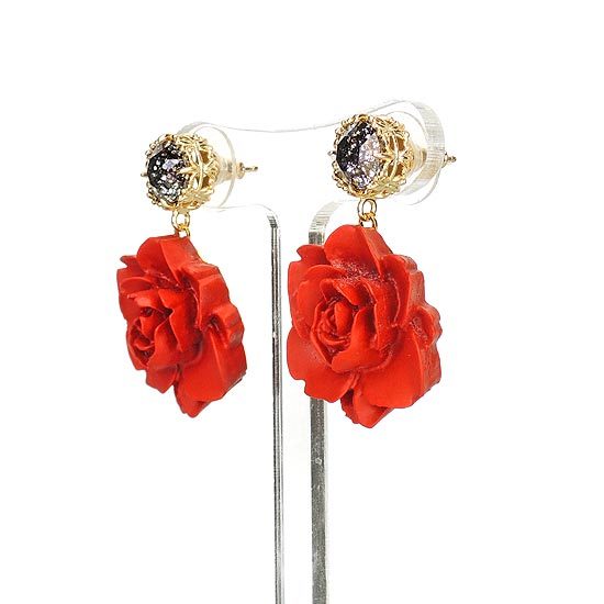 女巫輕輕揮舞著魔法棒,艷麗的紅色薔薇在暗黑森林中美麗綻放!獨特花紋黑色水晶,猶如森林古堡的夜空,搭配紅色薔薇古董墜飾,配戴起來搖曳生姿,魅惑動人!耳針為純銀鍍18K金材質,水晶耳環座臺為合金鍍18K金材質;水晶部分採用Crystallized-施華洛世奇元素;薔薇墜飾為塑酯材質。