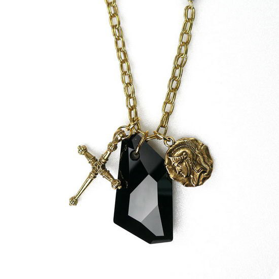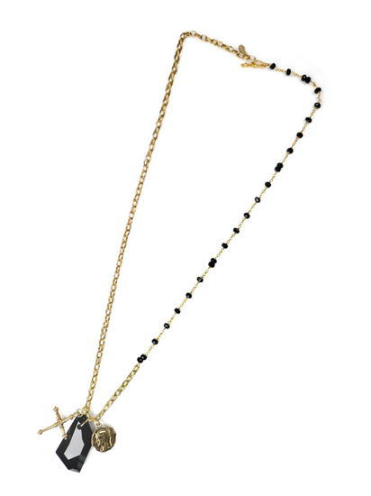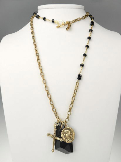 長鍊點綴黑瑪瑙搭配鍍金十字架、古錢幣墜飾及大型不規則切面黑色SWAROVSKI水晶墜飾。