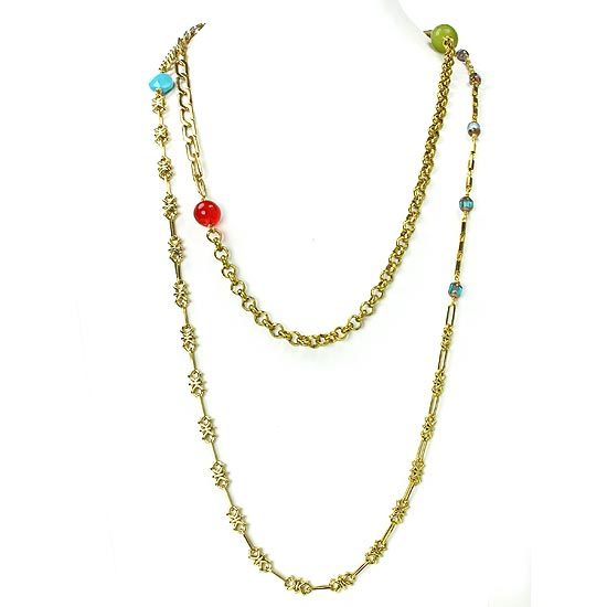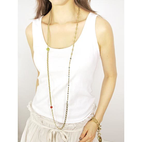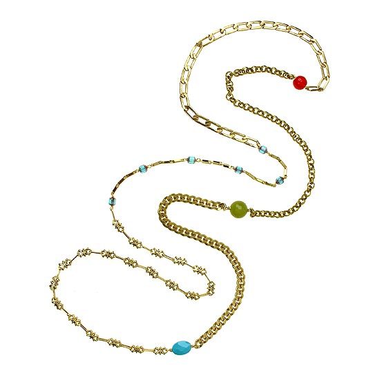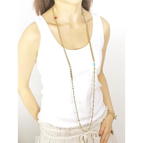 以不同環節的手工鍊結合琉璃珠、玉石、土耳其石等墜飾做變化,設計出豐富層次的效果。