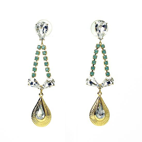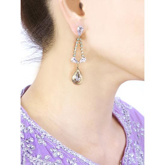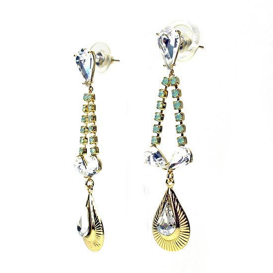 耳環為水晶鑽鍊與水滴形水晶組合而成的垂墜式耳環,下方有水晶點綴的眼鏡蛇眼造型墜飾。
