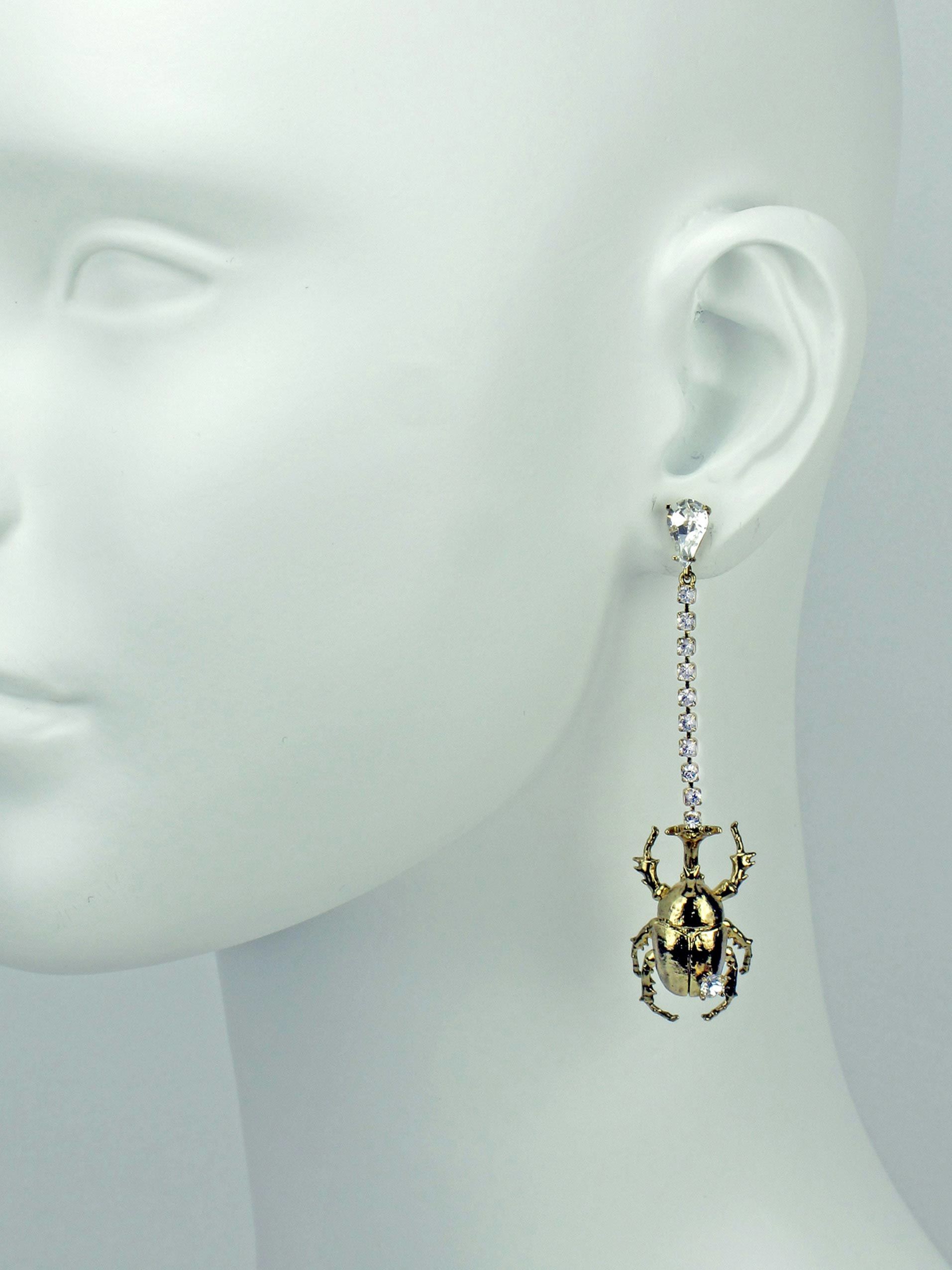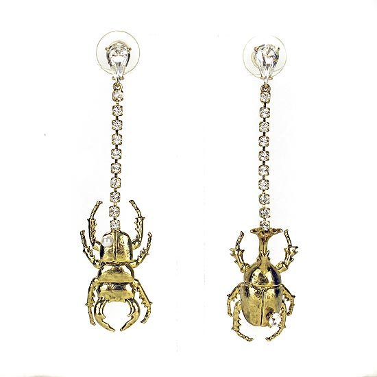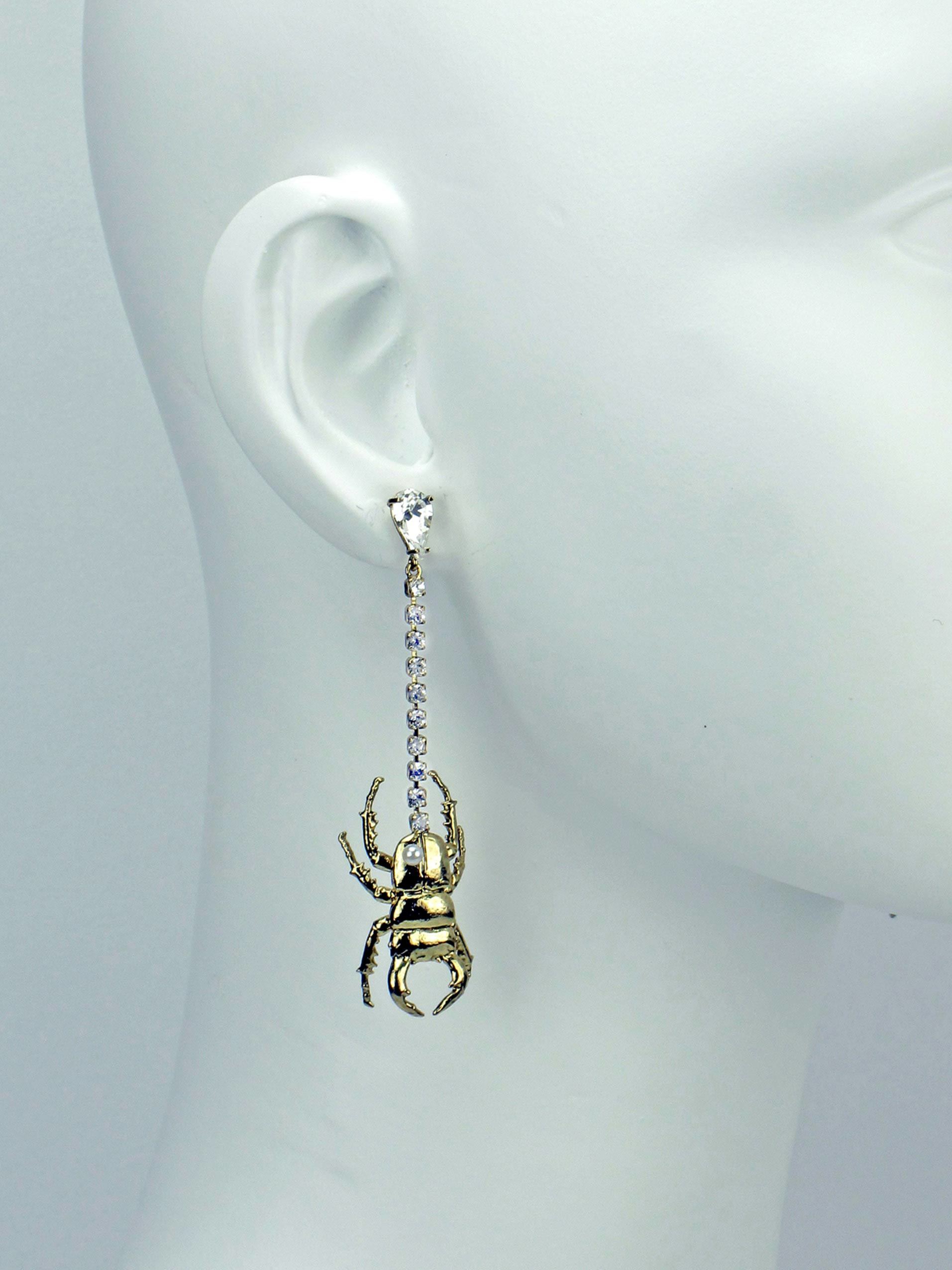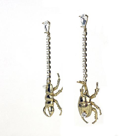 耳環以不對稱設計,以水晶鑽鍊綴以細緻刻畫的鍬形蟲及獨角仙造型墜飾,隨著姿態生動地搖曳著,捎來春夏活潑、熱情的氛圍,配戴起來個性亮眼!