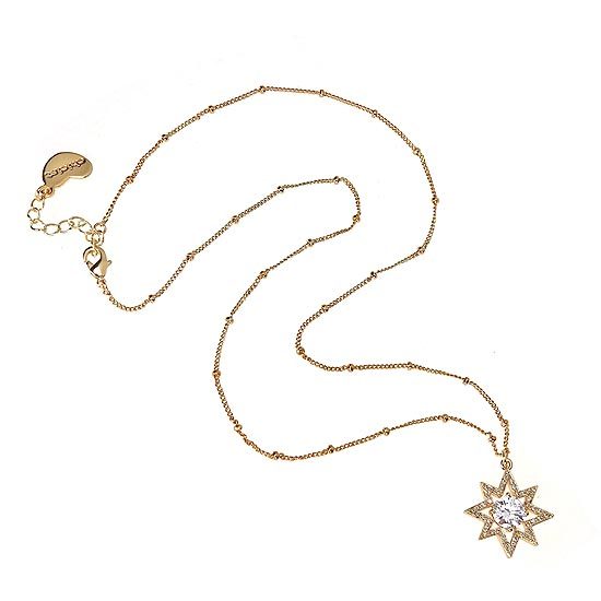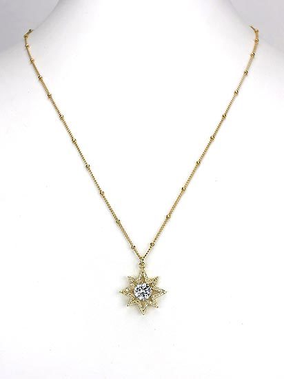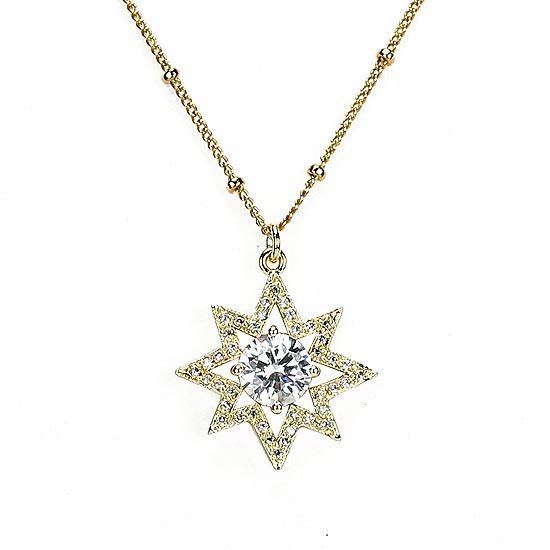 在繁星簇擁下,誕生一位充滿智慧與勇敢的美麗女神~ 細緻珠鍊,搭配頂級鋯石釘鑲的星芒墜飾,光芒狀的幾何線條,俐落雅緻,光彩奪目,十分好搭配!