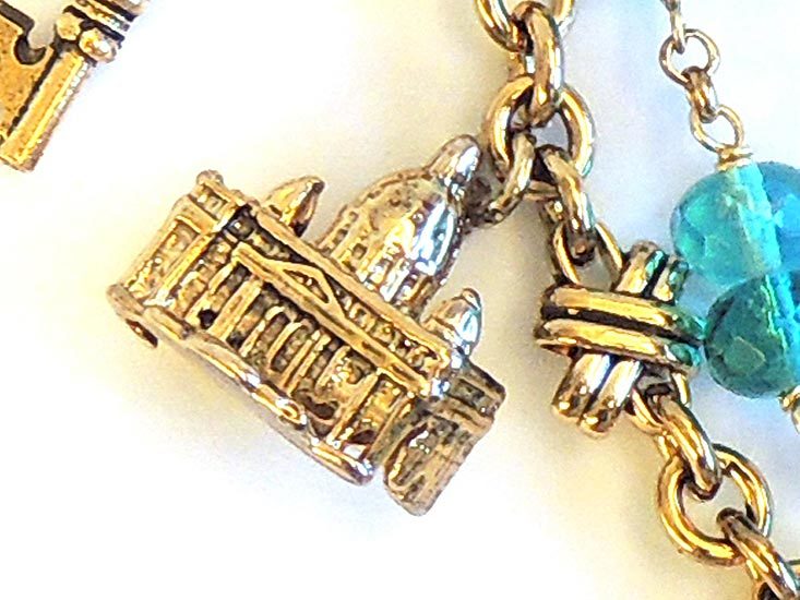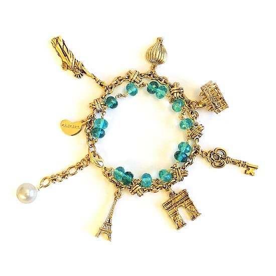 手鍊為銅合金鍍18K古董金材質;水晶珍珠部分採用Crystallized-施華洛世奇元素;手鍊總長尺寸為6英吋;延長鍊為1 1/2英吋;;巴黎鐵塔墜飾尺寸為23mm X 8mm;凱旋門墜飾尺寸為15mm X 14mm;古典耀匙墜飾尺寸為25mm X 10mm;城堡墜飾尺寸為12mm X 15 mm;熱汽球墜飾尺寸為12mm X 10mm;自由女神像墜飾尺寸為33mm X 10mm