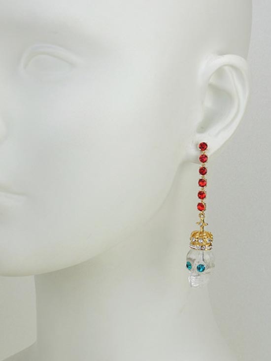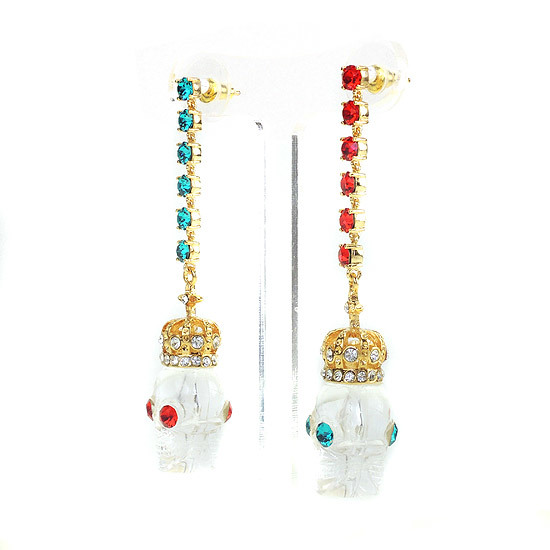 水晶鑽鍊搭配透明骷髏頭墜飾,鮮豔對比色調,充滿奇幻詼諧的節慶氣氛。