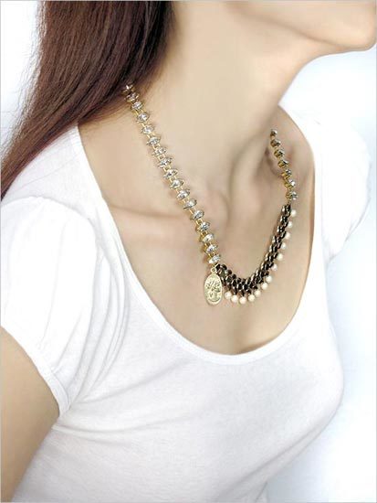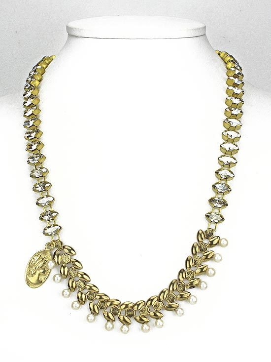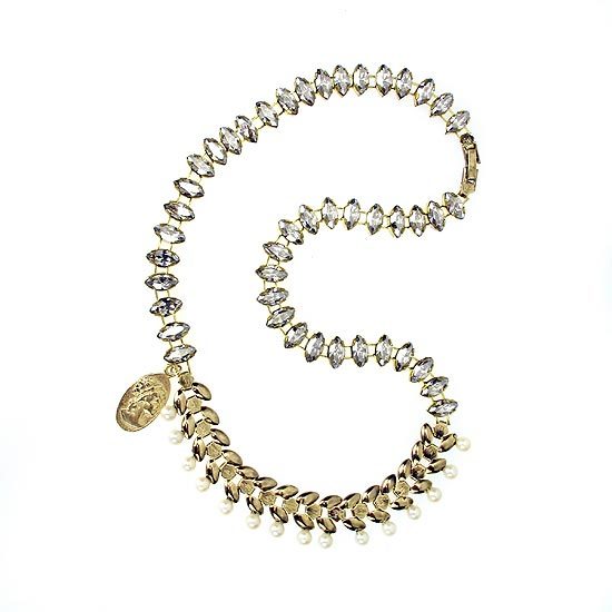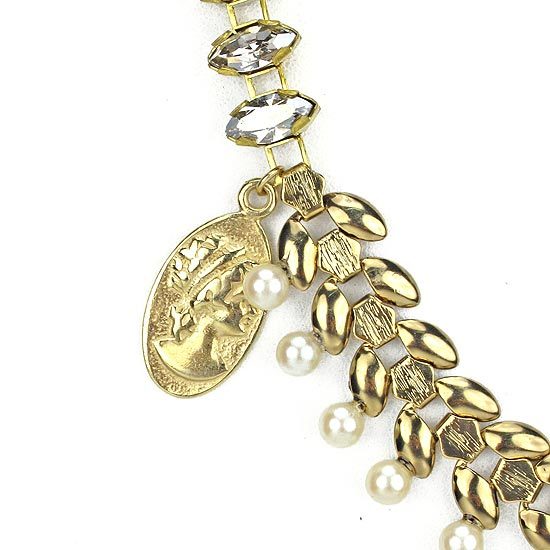 鍊身由桂冠葉形手工鍊結合貓眼形水晶鍊而成,手工鍊身外圍綴上水晶珍珠,並飾以仕女圖像墜飾,復古卻帶有低調華麗的巴洛克風格,璀璨卻不過份奢華!