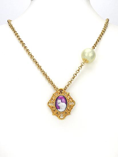 項鍊為合金鍍古董金材質;塑酯墜飾座台為合金鍍18K金材質;珍珠為仿古珠;項鍊總長尺寸為20 1/2英吋;延長鍊尺寸為2英吋;仿古珍珠直徑為17mm;塑酯墜飾尺寸為38mmX34mm