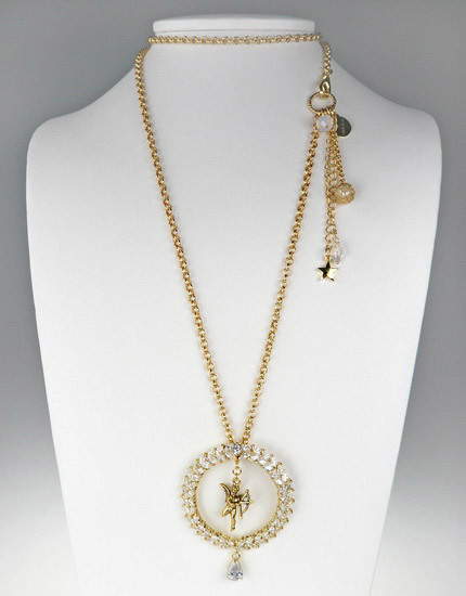 墜飾採寶石製作方式,精緻爪鑲貓眼形SWAROVSKI水晶環繞而成的華麗月桂葉皇冠,下方垂吊SWAROVSKI單顆水滴型水晶,幸運天使及金屬部份為合金材質。
