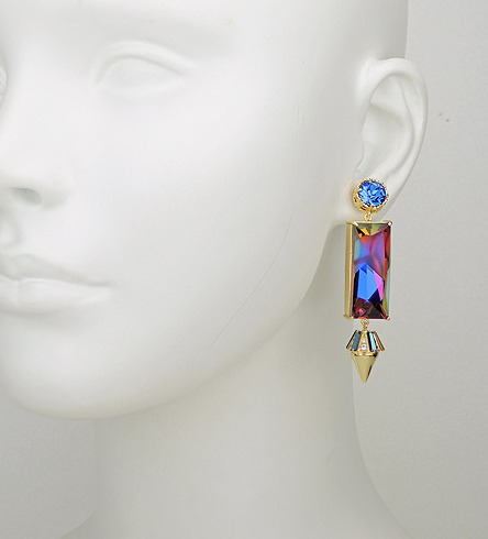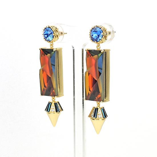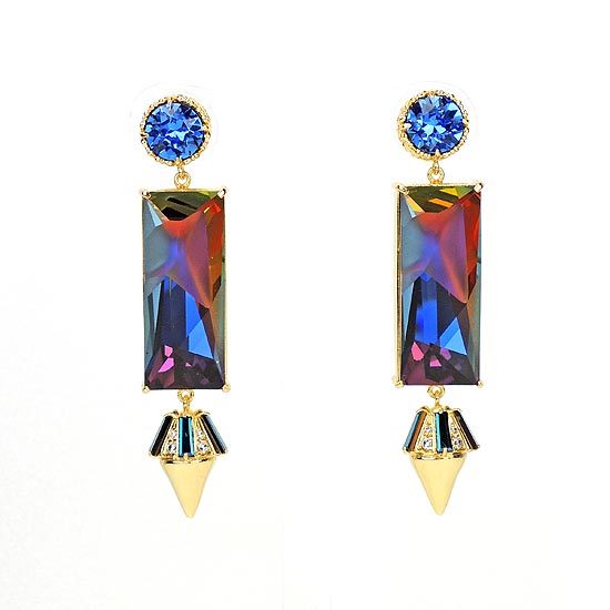 四爪鑲藍色水晶,搭配長方形的幻彩爆裂水晶墜飾, 以及鑲嵌鋯石與水晶的卯釘墜飾,配戴起來奢華與個性具備,無論正式或休閒亦可搭配。