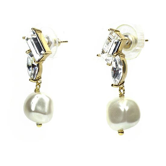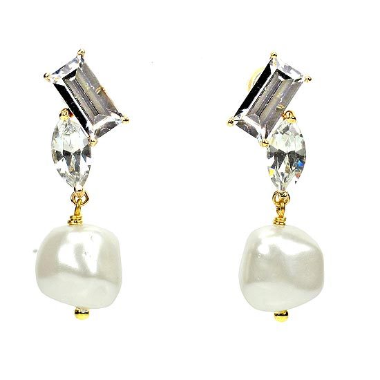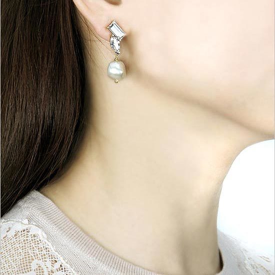 耳環以T型水晶結合貓眼形水晶,下方綴有法國變形水晶珍珠。