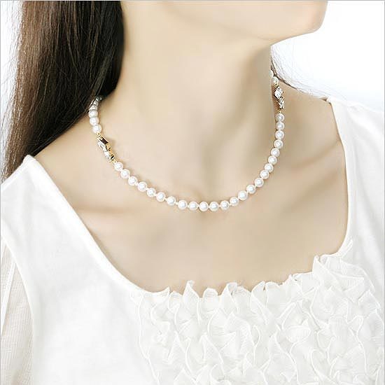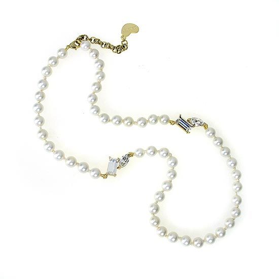 頸鍊以天然淡水珍珠結合T形及貓眼形水晶組合而成。迷人風尚的珍珠短鍊,配戴於鎖骨間,流露出優雅女人味,時尚款必備單品。