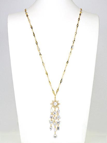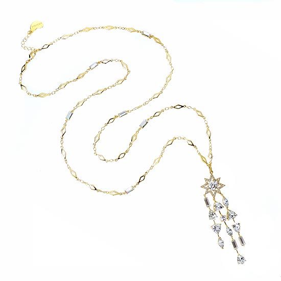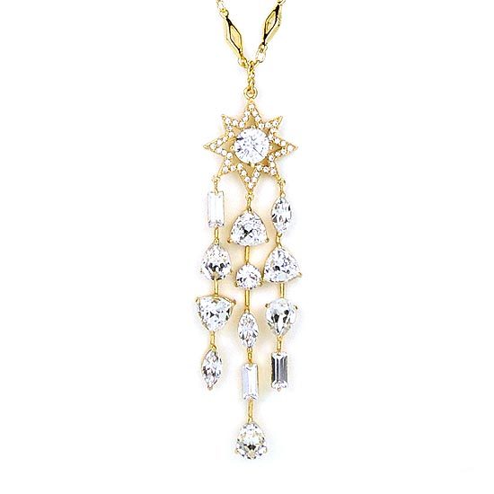 質感非凡的手工鍊身飾以爪鑲T型水晶,並搭配頂級鋯石釘鑲的星芒墜飾,下方垂墜爪鑲不同切割面的水晶。