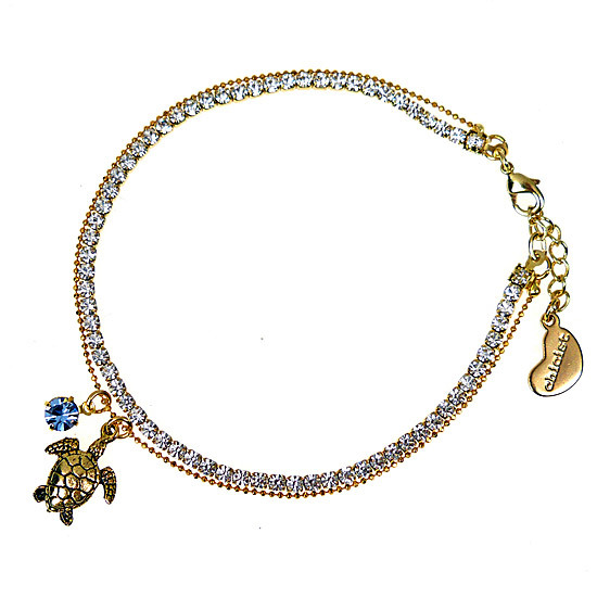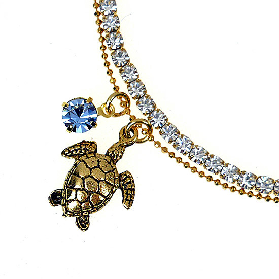 腳鍊採雙鍊設計,以珠鍊搭配SWAROVSKI水晶鑽鍊,並綴有合金材質的海龜墜飾搭配水藍色SWAROVSKI水晶墜飾,逗趣可愛的海龜腳鍊,在您的腳踝上展現俏麗、獨特的女性魅力!