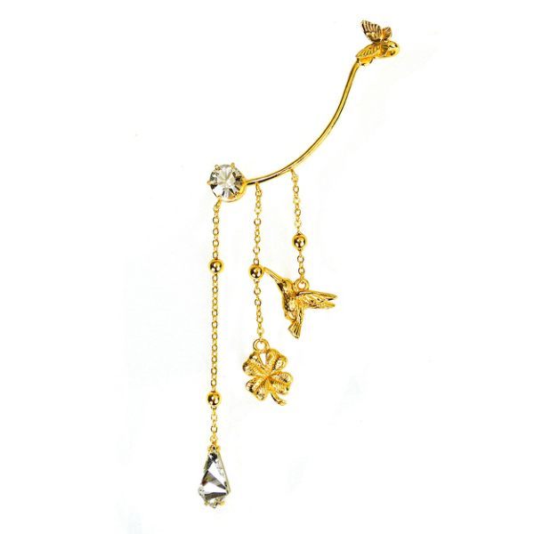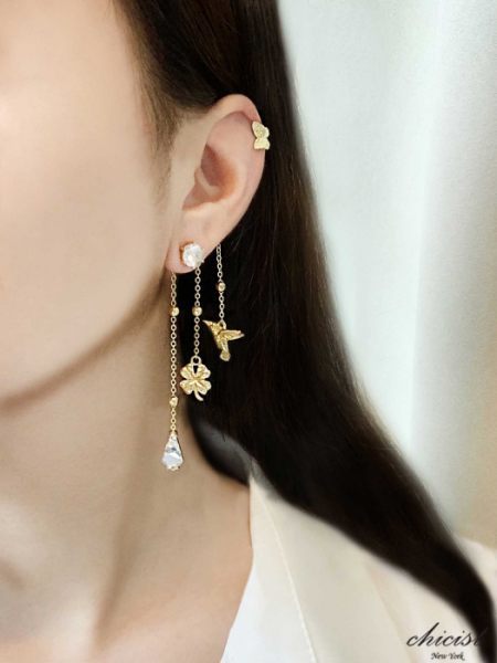 耳針為純銀鍍18K金材質;耳環金屬部分為合金鍍18K金材質;耳環長2 7/8英吋,寬2 1/8吋;墜鍊各長1、1.5、2英吋;水晶約1.3x0.7cm;幸運草約1.3x1cm;蜂鳥約1.3x1.7cm。