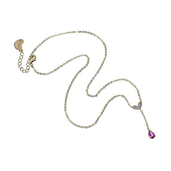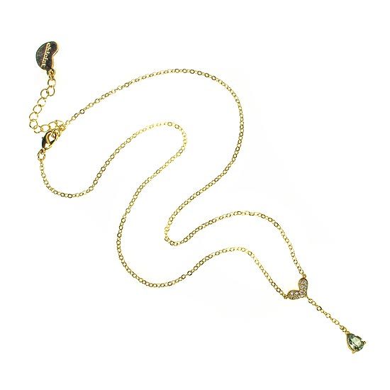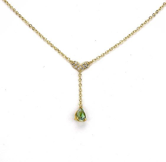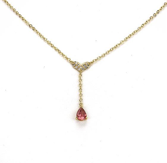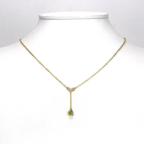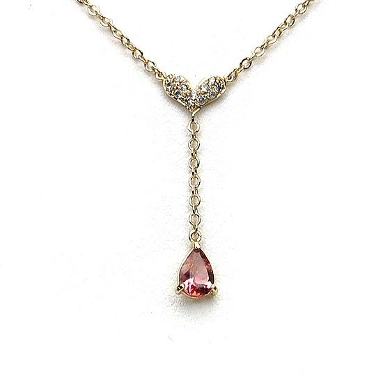霎那的眼神相會,無盡甜蜜湧上心頭...古典釘鑲鋯石心形墜飾,下方垂墜爪鑲水滴形天然碧璽,T字鍊的設計,為女性優美的頸部線條加分!細膩精巧的風格,不可或缺的必備款!鍊身為銅身鍍18K金材質、鑲臺為純銀鍍18K金材質。