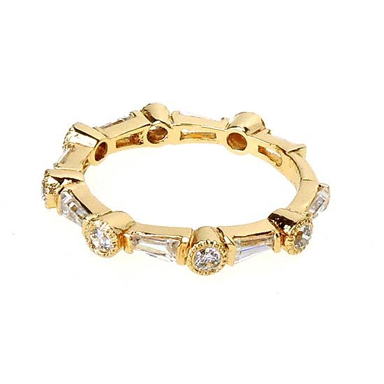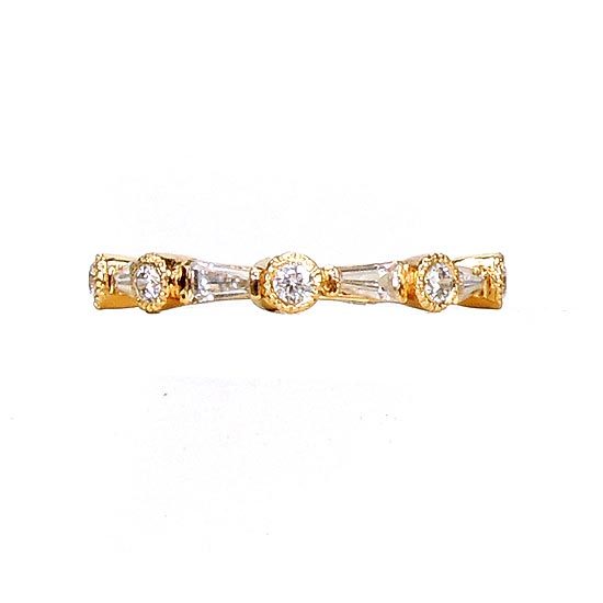 相遇、相戀的二個人,共同譜出一段段美麗的愛情詩歌…。戒身以梯型及圓型的鋯石完美銜接而成,結合古典與現代的鑲工,雋永迷人…。可單一配戴或與其他戒指搭配,更突顯個人風格!戒臺為純銀鍍18K金材質。戒圍尺寸為國際標準圍10號,此款戒指為特別訂製款,可預先訂做您所需要的尺寸,製作天數為不含週末的7個工作天。
