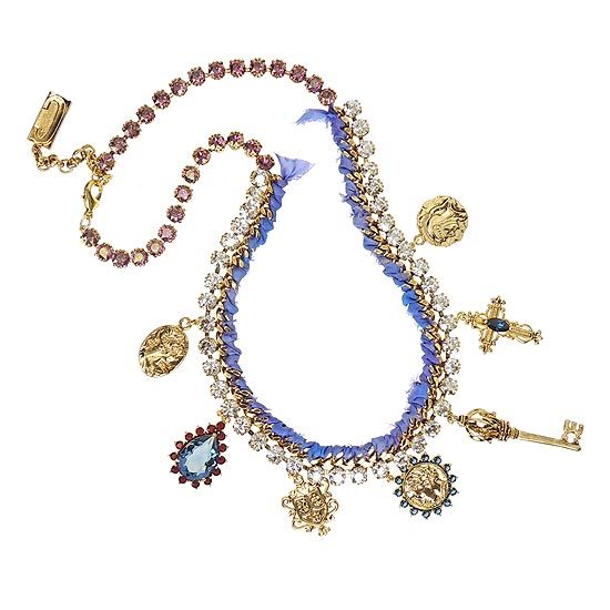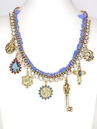 復古色調的鍊身搭配手工絲緞,再飾以水晶鑽鍊及拜占庭風情的錢幣、十字架、古城鑰匙..等多種特色墜飾,配戴起來華美大氣,是不容錯過的奢華單品!
