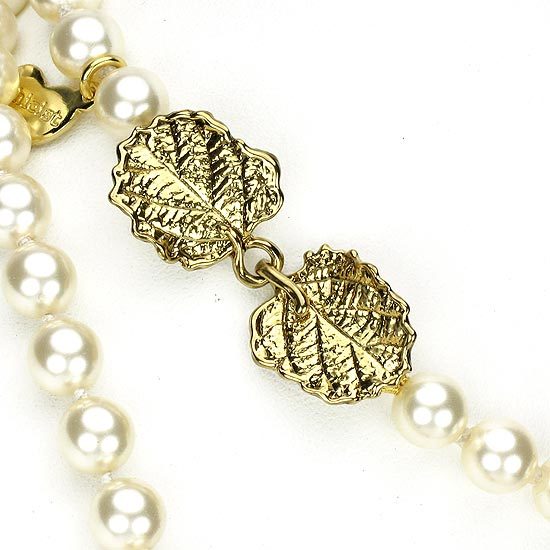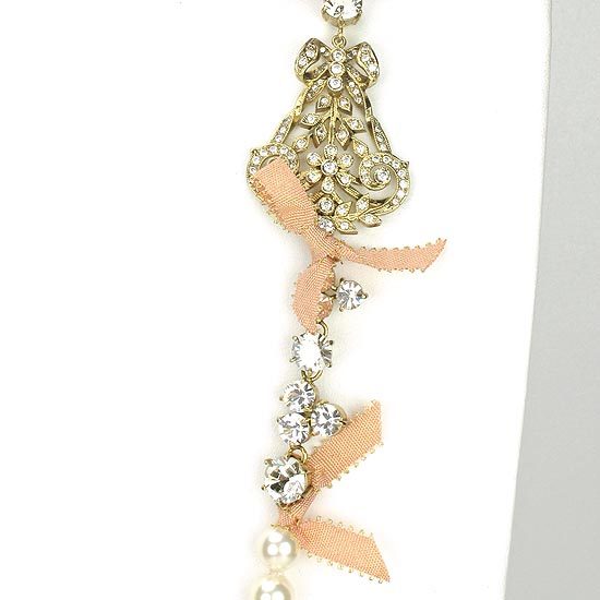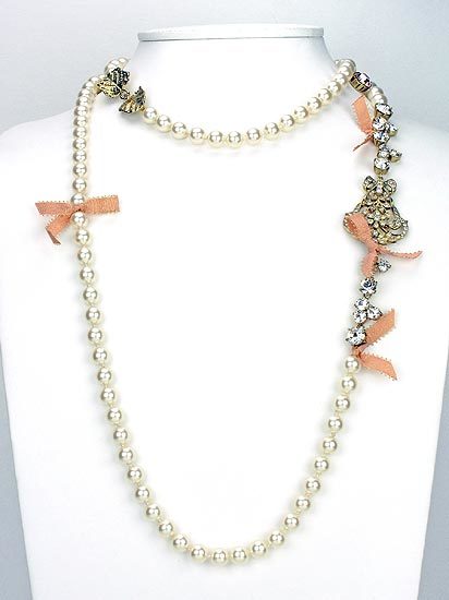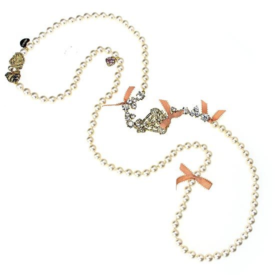 水晶珍珠搭配唯美墜飾、並以古典釘鑲鋯石呈現光采,加上歐洲皇室古董金邊緞帶點綴,耀眼別緻的設計,配戴起來浪漫柔美,為一款精緻典雅的珍珠長項鍊!