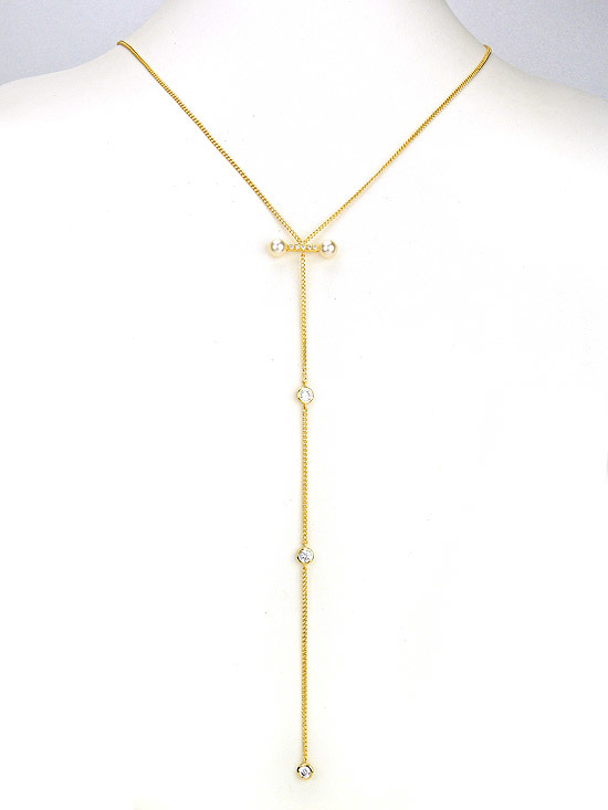 精巧雅緻的Y字墜鍊;鑲嵌鋯石與針珠搭配;頸鍊金屬部分為合金鍍18K金材質;水晶珍珠材質採用Crystallized-施華洛世奇元素