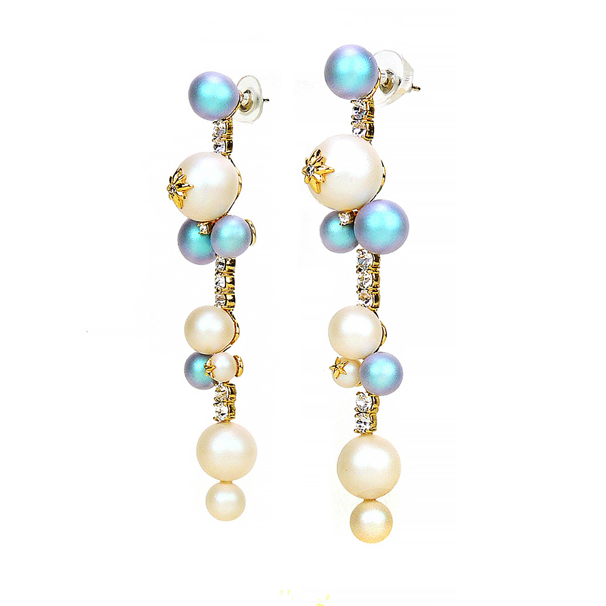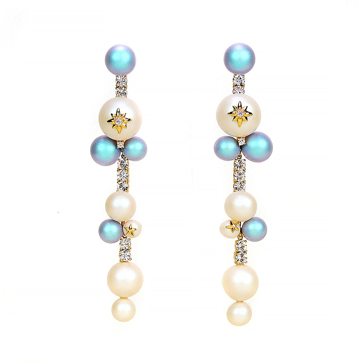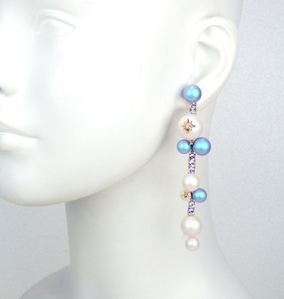 藍色及白色粉霧珍珠交錯串連,並鑲嵌大小的閃耀鋯石,巧妙的工藝讓珍珠在配戴時能隨著姿態擺動,優雅及氣質滿分。