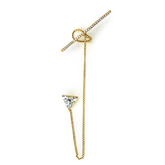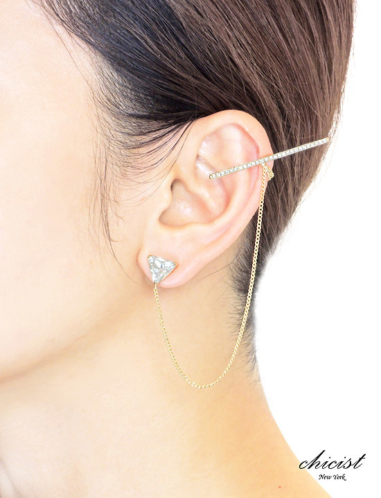 三角形貼耳耳針,以金屬鍊連結,精緻鑲嵌的金屬線條耳夾,充滿時尚個性,讓你成為獨一無二的焦點!。