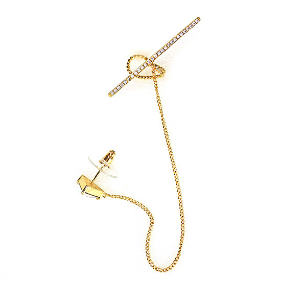 三角形貼耳耳針,以金屬鍊連結;精緻鑲嵌的金屬線條耳夾;耳針為純銀鍍18K金材質;耳環金屬部分為合金鍍18K金材質;三角形耳針邊長為:10mm;鑲鑽長線條耳夾長度:38mm