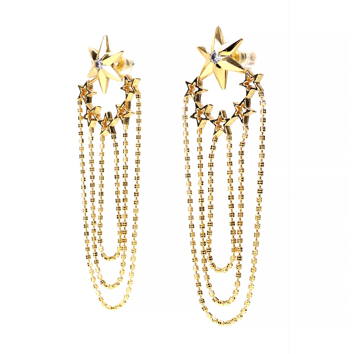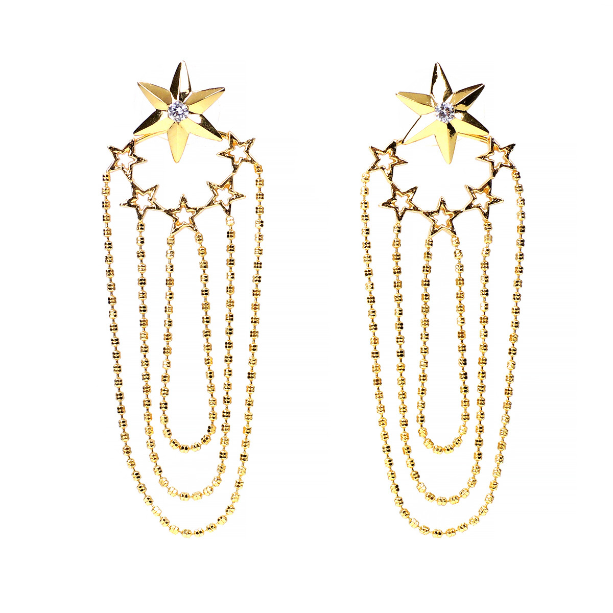變化版的流蘇耳環;耳環後座以垂墜鍊子及星星墜飾表現流星的意象,佩戴起來動感優雅。