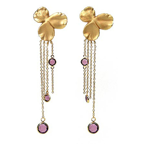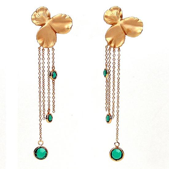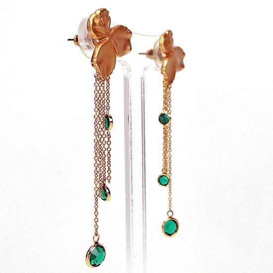 耳環以立體的幸運葉結合流蘇設計呈現,流蘇並飾以包鑲綠、紫色SWAROVSKI水晶點綴,輕柔的春天色彩與流蘇的搭配設計,給人一種清新脫俗又具時尚的味道!