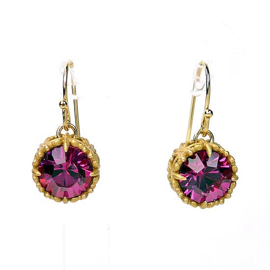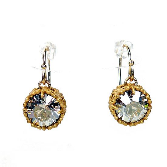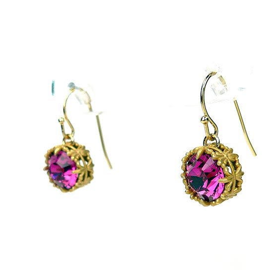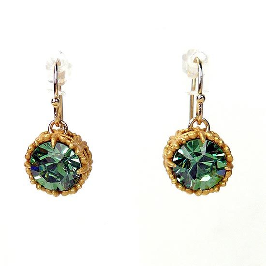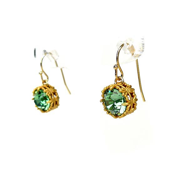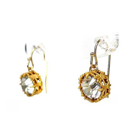 耳環以勾式耳針設計,墜飾座臺以復古色調呈現,以圓形水晶四爪鑲以鳶尾花樣圖騰座臺,精緻、古典風格襯托出耳環特色與質感。
