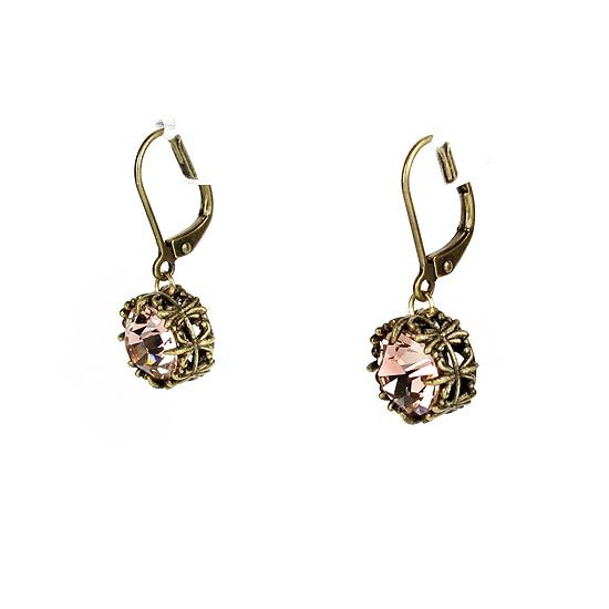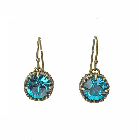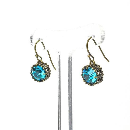 耳環以勾式耳針設計,墜飾座臺以復古色調呈現,以圓形水晶四爪鑲以鳶尾花樣圖騰座臺,精緻、古典風格襯托出耳環特色與質感。