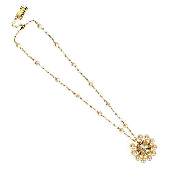 鍊身及金屬部分為合金鍍18K金材質;水晶與水晶珍珠材質採用Crystallized-施華洛世奇元素;頸鍊總長19 1/4英吋;延長鍊長1 1/4英吋;墜飾尺為寸1 3/8 x 1 3/8英吋