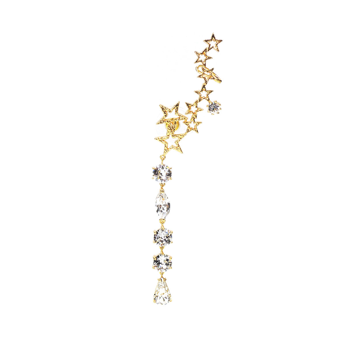 單邊設計的耳環,順著耳垂弧度的星星串連造型耳針,延伸各式閃耀的水晶切面鑽鍊垂墜,