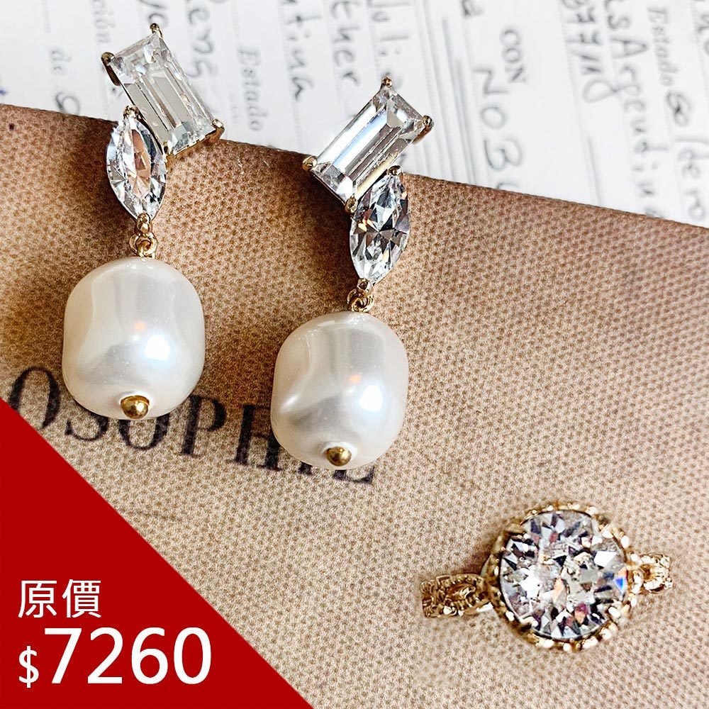 耳環以T型水晶結合貓眼形水晶,下方綴有法國變形水晶珍珠。