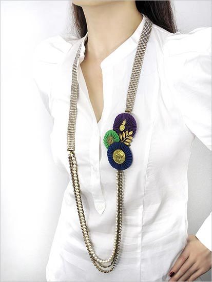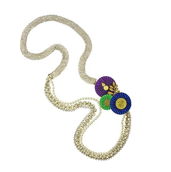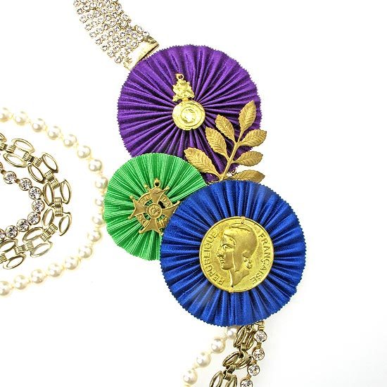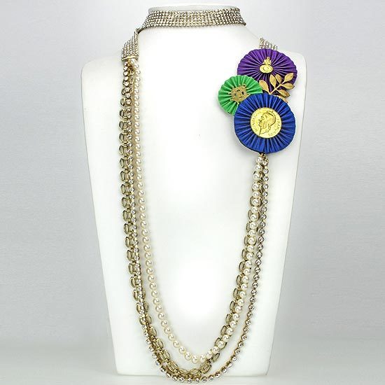 項鍊結合珍珠鍊、手工鍊及水晶鑽鍊等層次設計,搭配壓摺緞帶裝飾,上面並飾有徽章、錢幣等墜飾,細膩而繽紛華麗的風格,古典與前衛時尚風兼具,值得收藏的奢華單品。