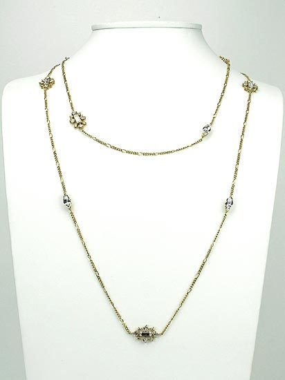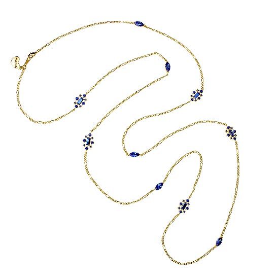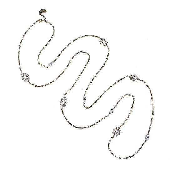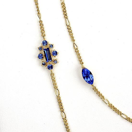 鍊身部分以不同大小水晶組合而成的墜飾及貓眼形水晶點綴,細緻優雅的風格,隨性亮眼,可依個人喜好或服裝搭配做長短的調整,為一款帶有休閒又不失高雅氣質的百搭長項鍊!
