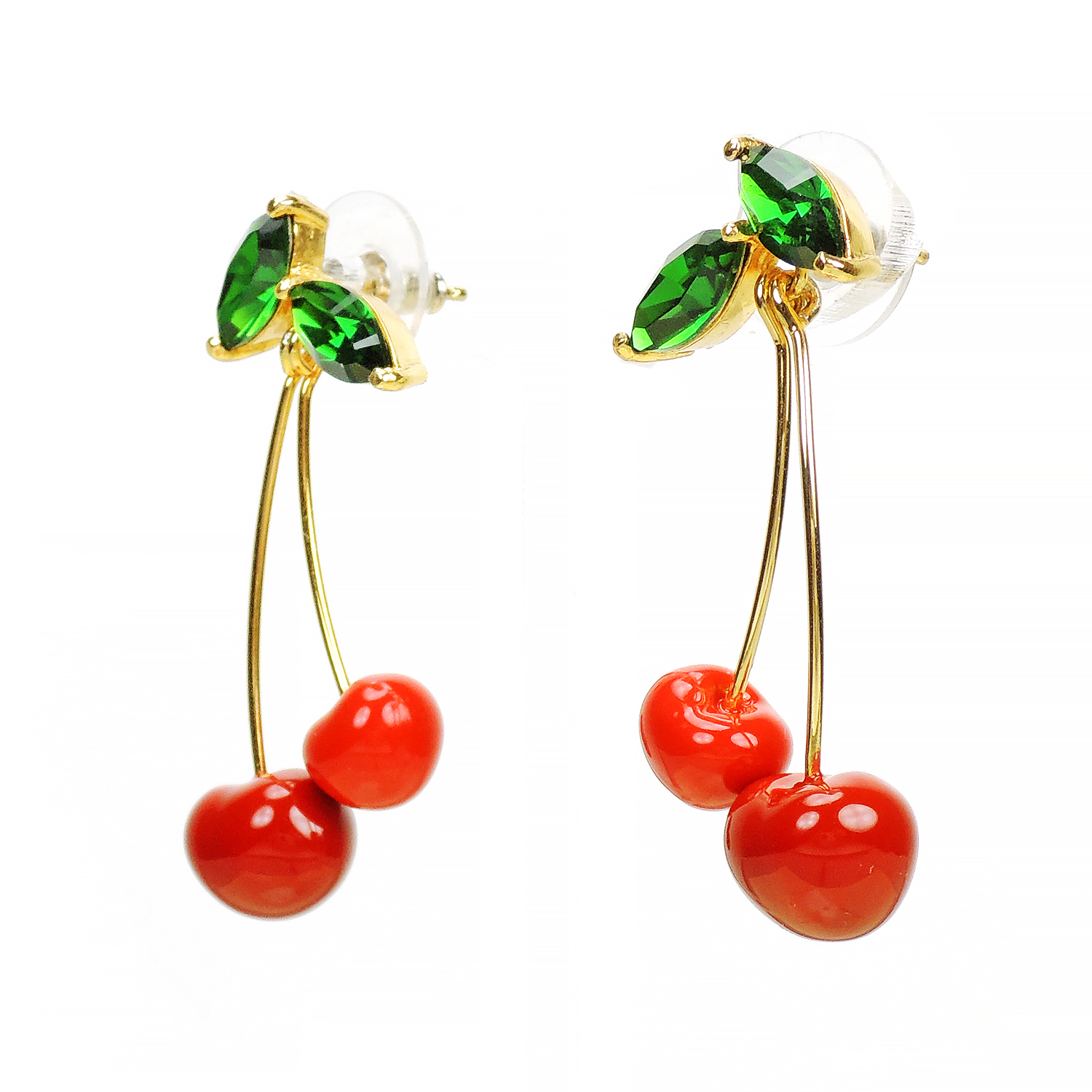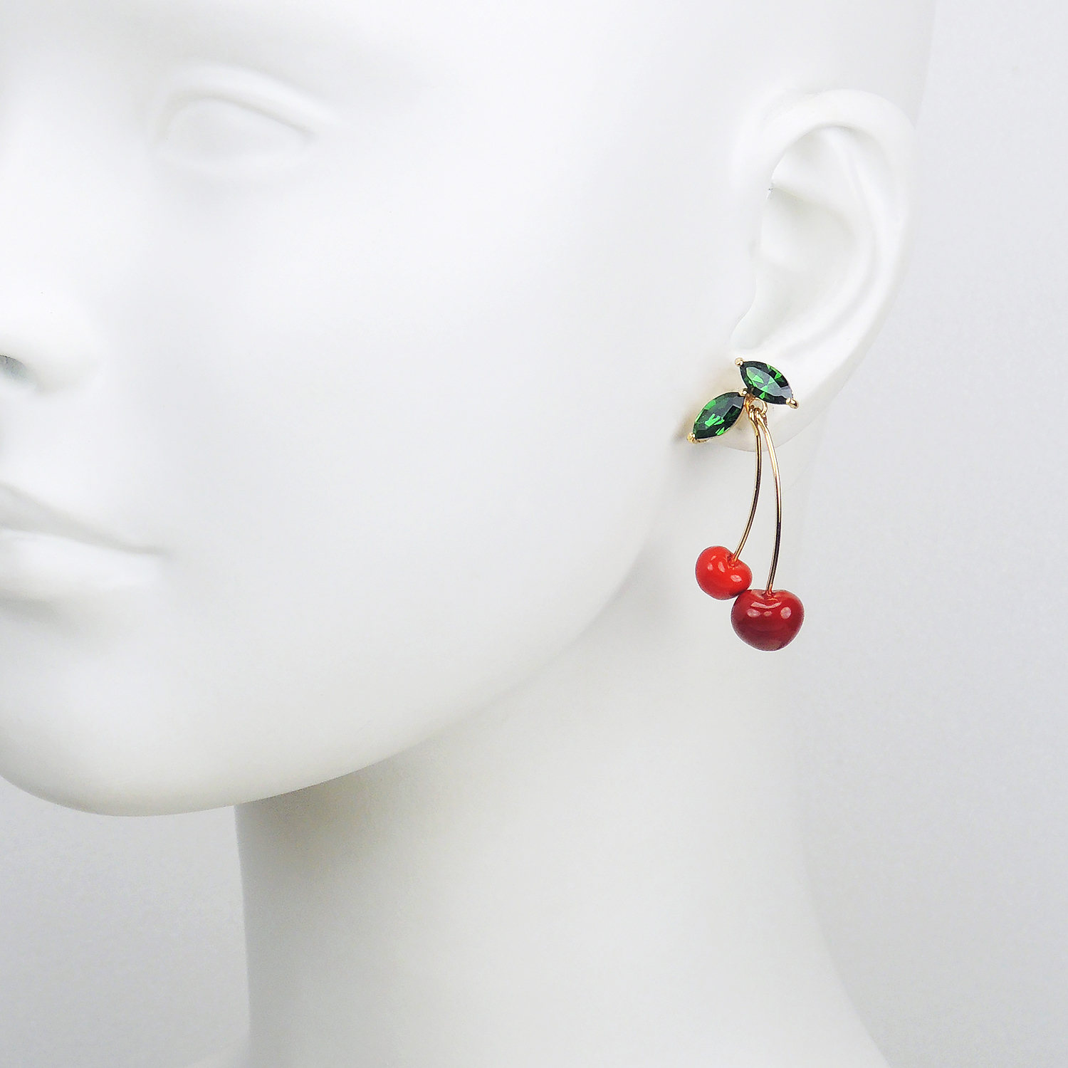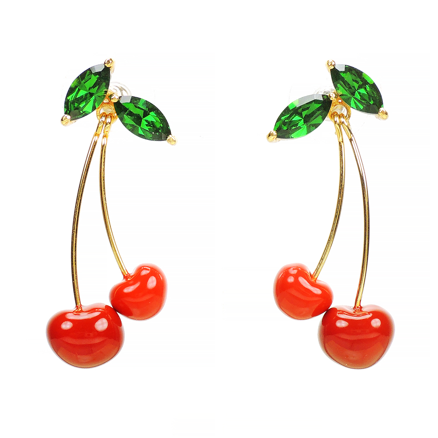 深綠色透亮的水晶葉片加上精緻作工的櫻桃果實墜飾,垂墜式的設計,可隨姿態搖曳擺動,