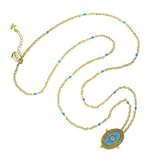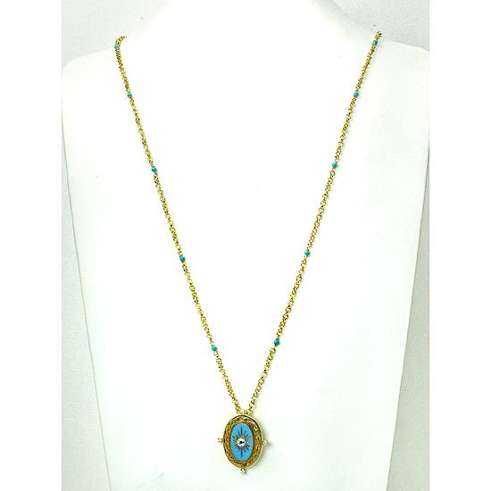 圖騰設計的土耳其石墜飾,以手繪金漆呈現出復古韻味,並飾以水晶裝飾,座臺旁綴有爪鑲鋯石。