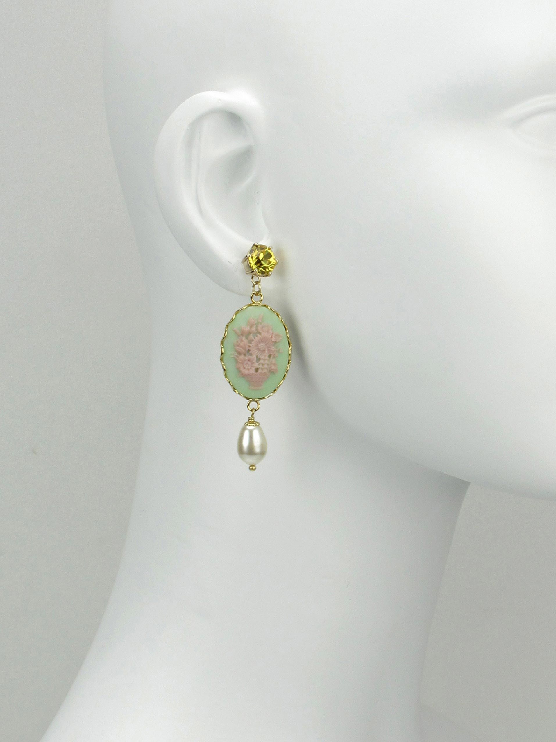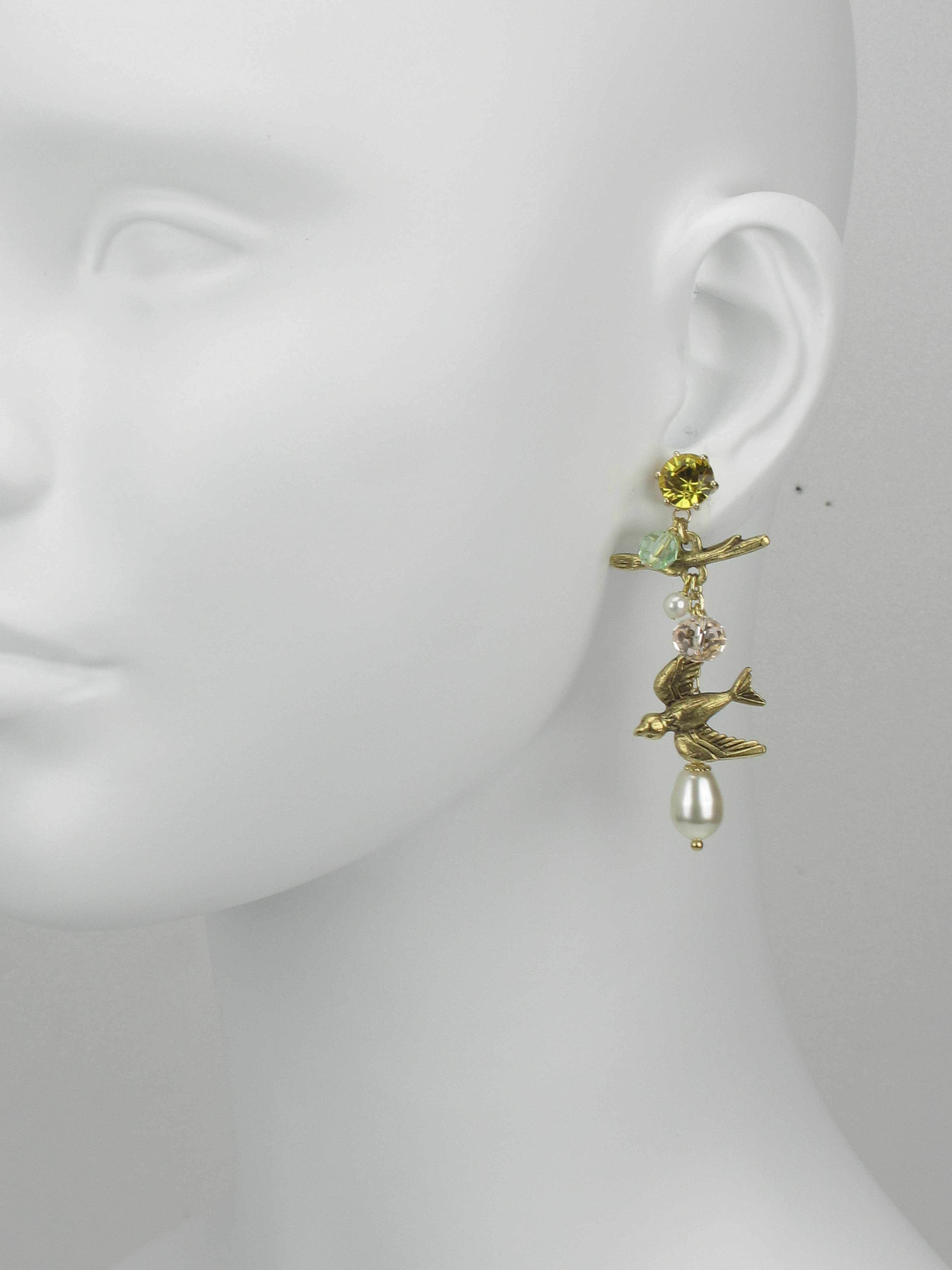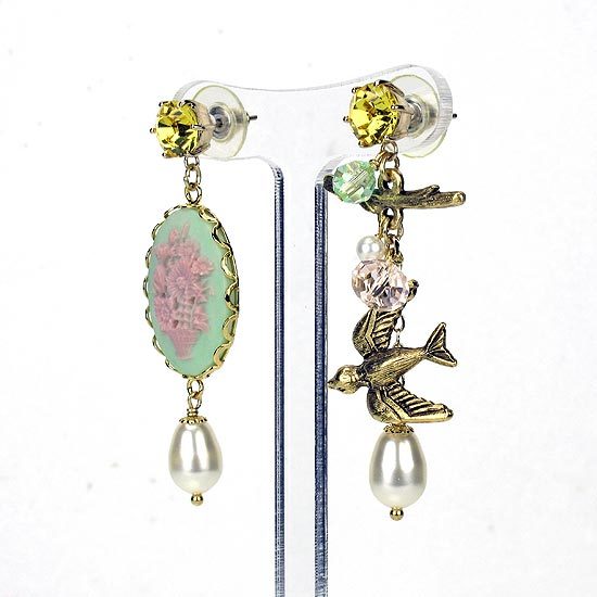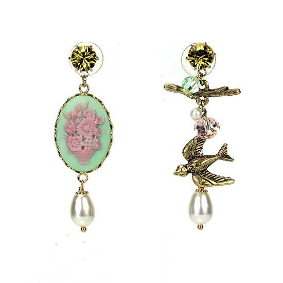 耳環兩邊採不對襯設計,一邊是以淡綠色為底的樹酯浮雕,襯出花朵的粉嫩;另一邊則是翱翔天際的飛鳥,搭配代表純潔的珍珠,顯現出童話般的夢幻景象。