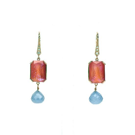 以夾鑲帝王式切割寶石,搭配古典水滴形玉石的垂墜式耳環,精巧浪漫的風格配戴起來知性大方,為一款大小女孩都適合的甜蜜單品。