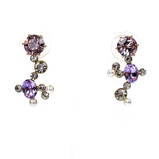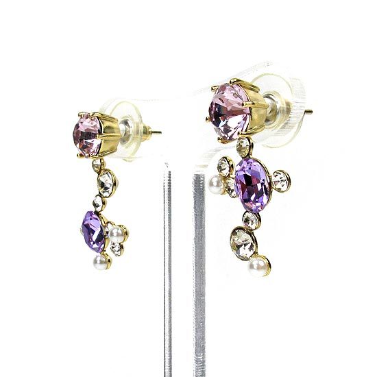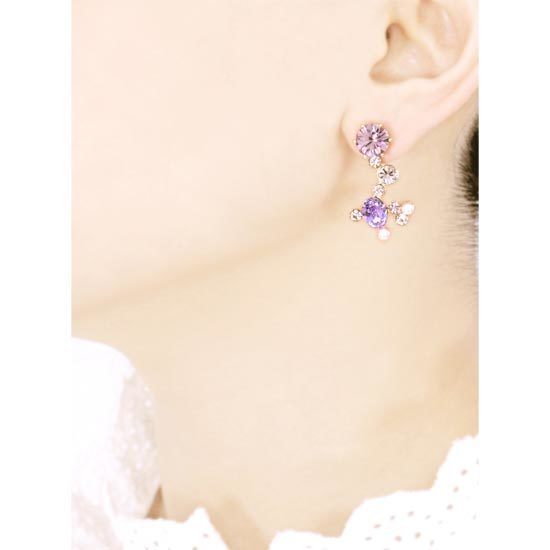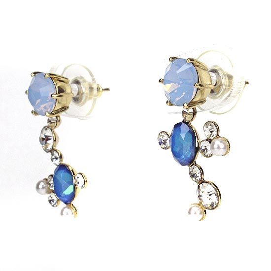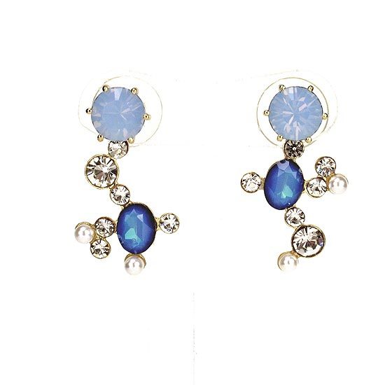 耳環兩邊採不對襯設計,以大小不等的圓形、橢圓形水晶、珍珠組合而成。