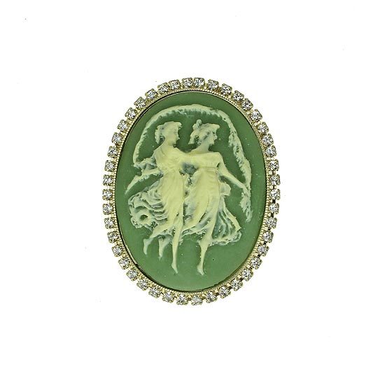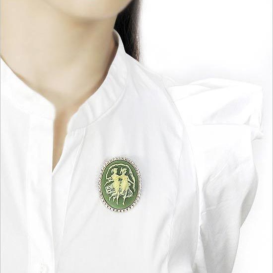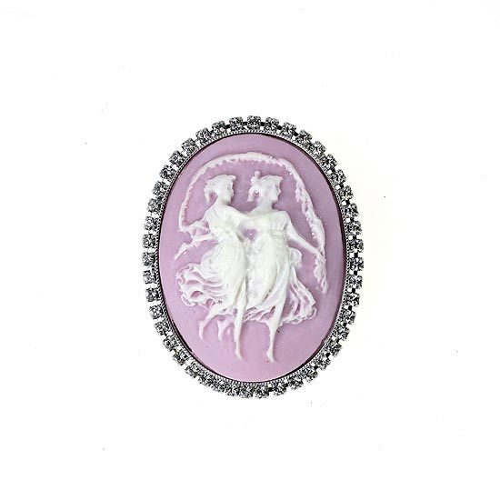 胸針以細膩精緻的手工女神浮雕為主體,周圍並飾以水晶鑽點綴。