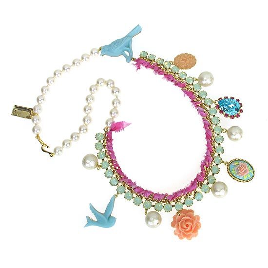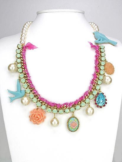 珍珠搭配仿古手工鍊身,加上水晶鑽鍊及象徵好運與福氣的鵲鳥、花朵…等多樣的墜飾,活潑的設計,展現春日盎然的景象,配戴起來俏麗甜美、搶眼獨特。