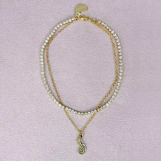 腳鍊採雙鍊設計,以SWAROVSKI水晶為鍊身,搭配合金材質的羽毛墜飾。
