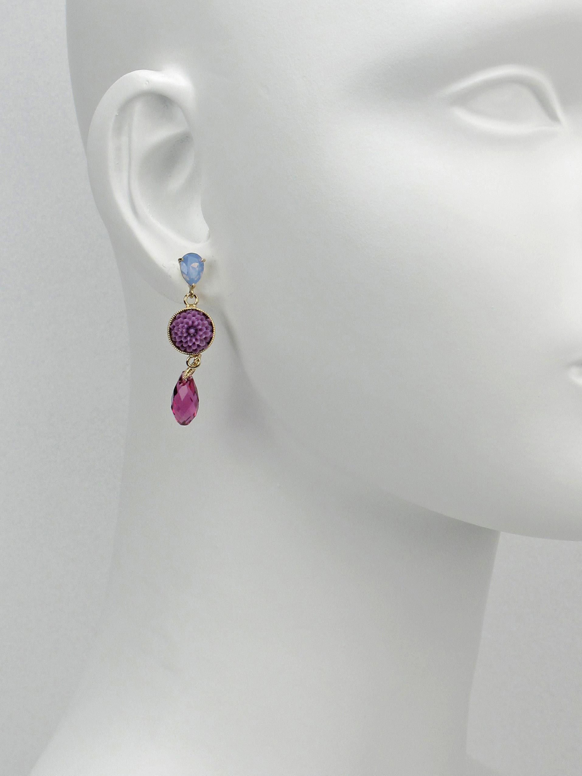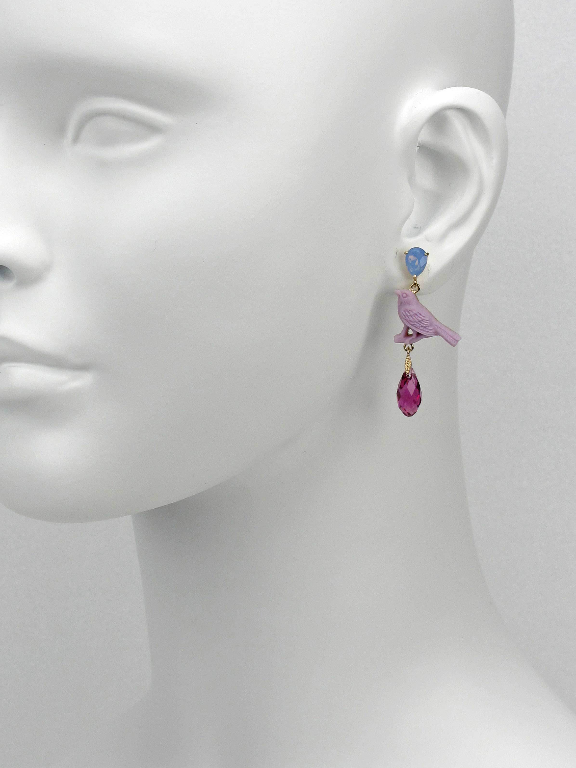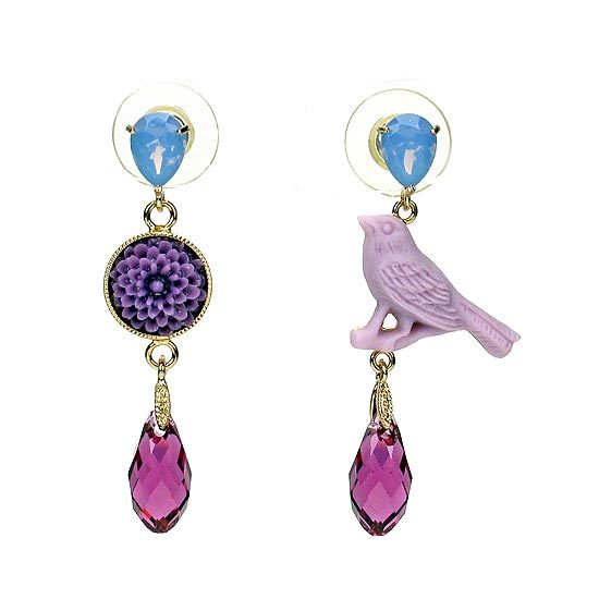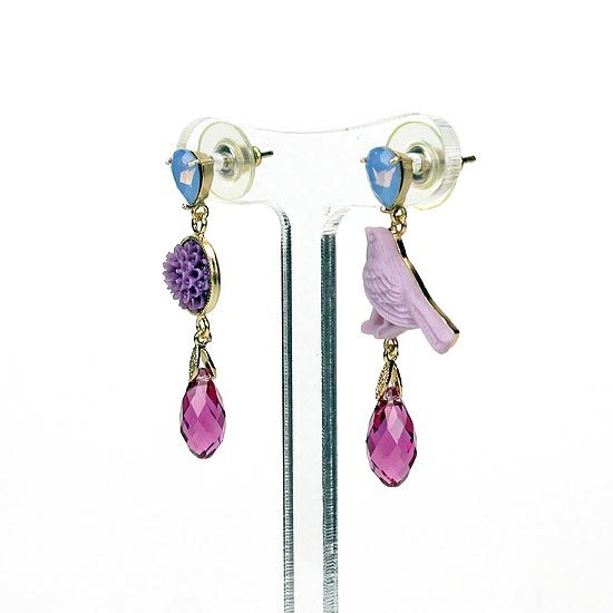 另一邊為細膩生動的鳥兒墜飾呈現,下方綴以水滴水晶形襯托,紫色系的浪漫色調展露春天的夢幻、活潑氣息,配戴起來甜美俏麗!
