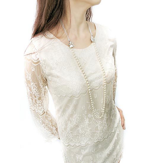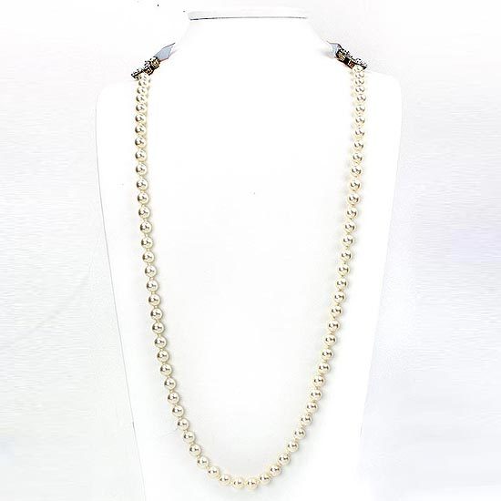 水晶珍珠串鍊結合花形水晶墜飾,後段採用法國緞帶綁帶設計,細膩多變的項鍊設計,迷人的法式情懷,女孩必備的經典款夢幻單品。
